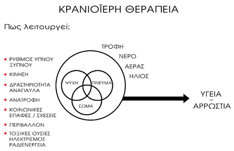 Η κρανιοϊερή θεραπεία είναι μία θεραπευτική αλλά και προληπτική μέθοδος για την αντιμετώπιση προβλημάτων στο σύνολο των λειτουργιών του ανθρώπου. Ήπιοι χειρισμοί πίεσης βάρους 5γρ. χρησιμοποιούνται, αρχικά για να εντοπιστεί και στην συνέχεια για να θεραπευτεί η δυσλειτουργία που υπάρχει στο κρανιοϊερό σύστημα. Πρόκειται για μια αληθινά βαθιά και πολύ σημαντική τεχνική που αντιμετωπίζει τον άνθρωπο ως μια ολότητα.